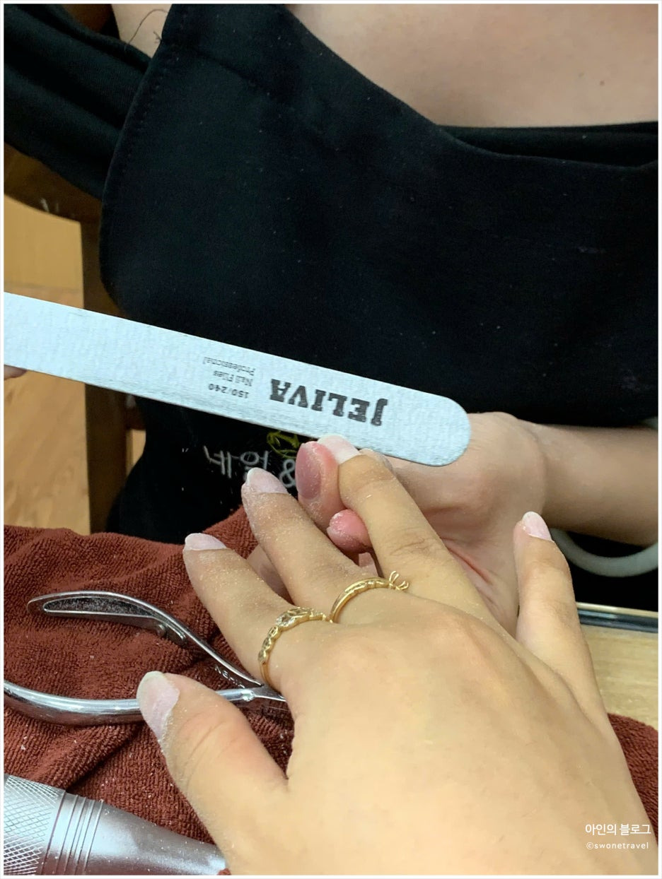 고객이 안심할 수 있는 부분은, 직원이 모든 도구를 고객 앞에서 직접 소독하고 준비한다는 점이에요. 위생 관리가 철저해서 믿음이 갔어요. 이후에는 작은 니퍼로 딱딱한 각질과 죽은 피부를 부드럽게 제거하고 따뜻한 수건으로 닦은 뒤 보습 오일로 마무리해줘서 손이 편안하게 진정돼요.